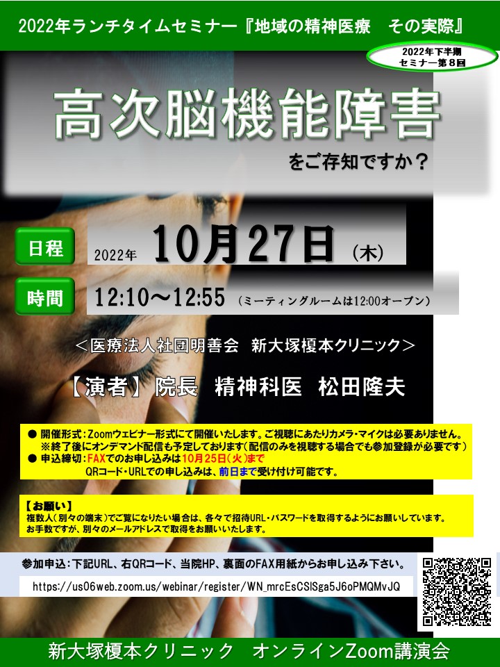 【zoomランチタイムセミナー⑧】2022.10.27 新大塚「高次脳機能障害をご存知ですか?」