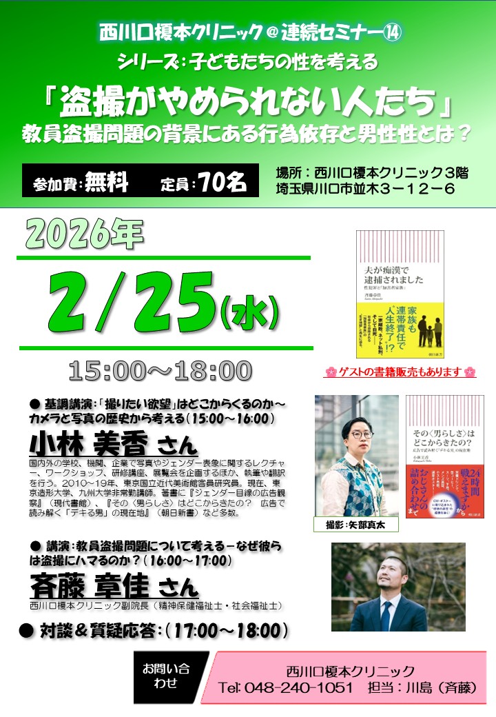 【西川口 連続セミナー⑬】盗撮がやめられない人たち~教員盗撮問題の背景にある行為依存と男性性とは?(シリーズ:子どもたちの性を考える)