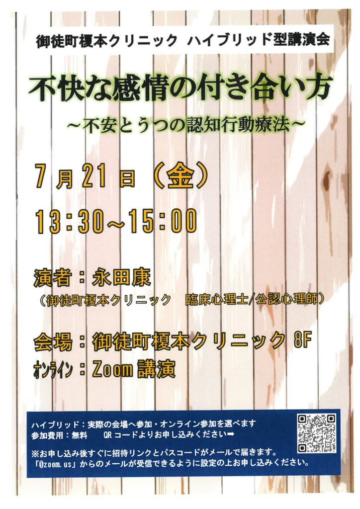 【連続セミナー⑤】2023.7.21 御徒町「不快な感情の付き合い方 ~不安とうつの認知行動療法~」