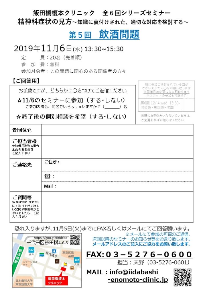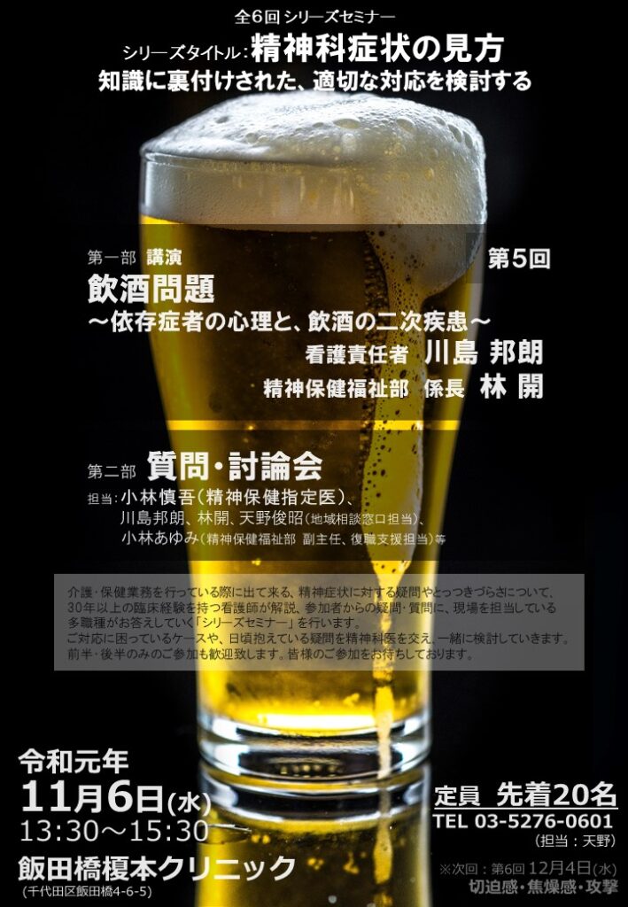 【2019.11.6(水)】飯田橋シリーズセミナー「精神症状の見方」第⑤回:飲酒問題
