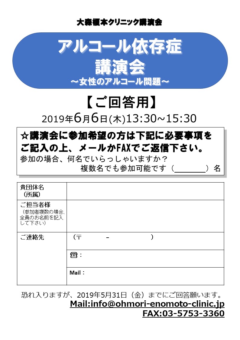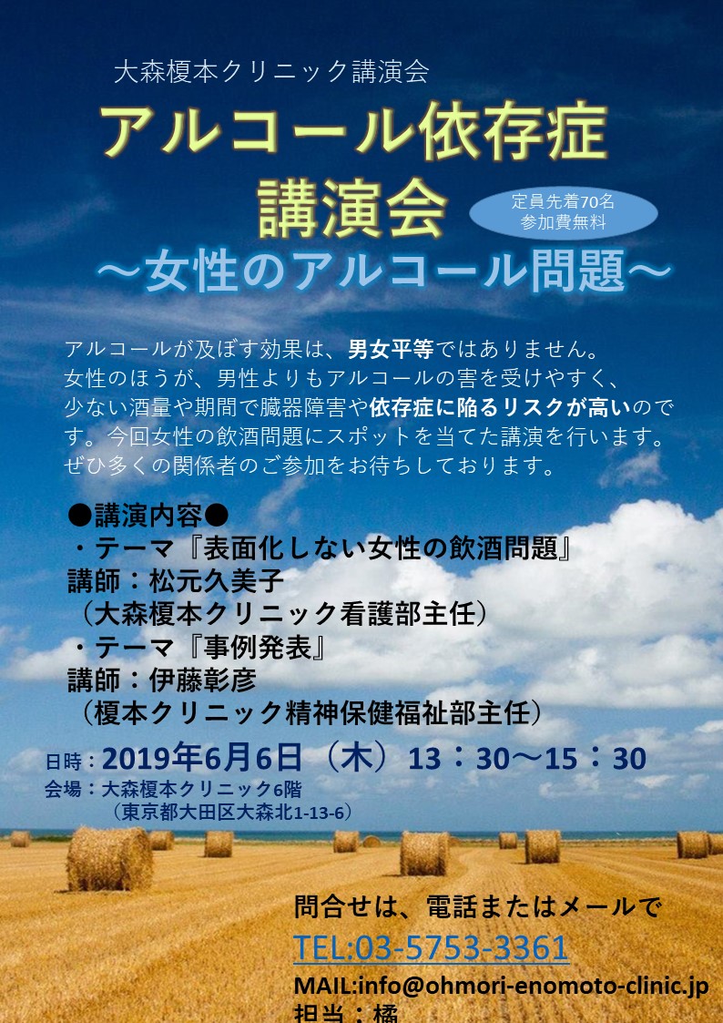 【2019.6.6(木)】大森榎本クリニック アルコール依存症講演会「女性のアルコール問題」