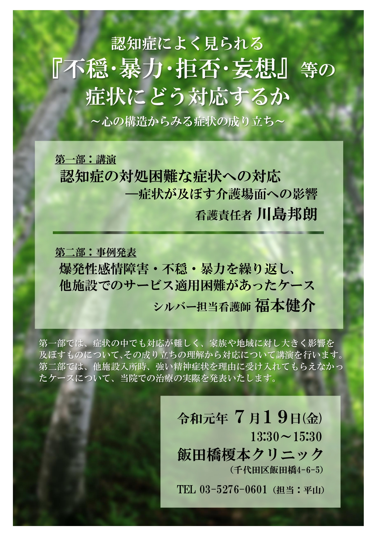 【2019.7.19(金)】飯田橋シルバーフロア講演会「認知症によくみられる 『不穏・暴力・拒否・妄想』等の症状にどう対応するか ~心の構造からみる症状の成り立ち~」