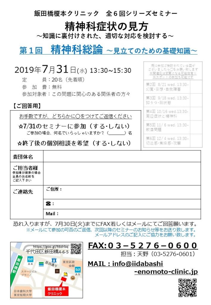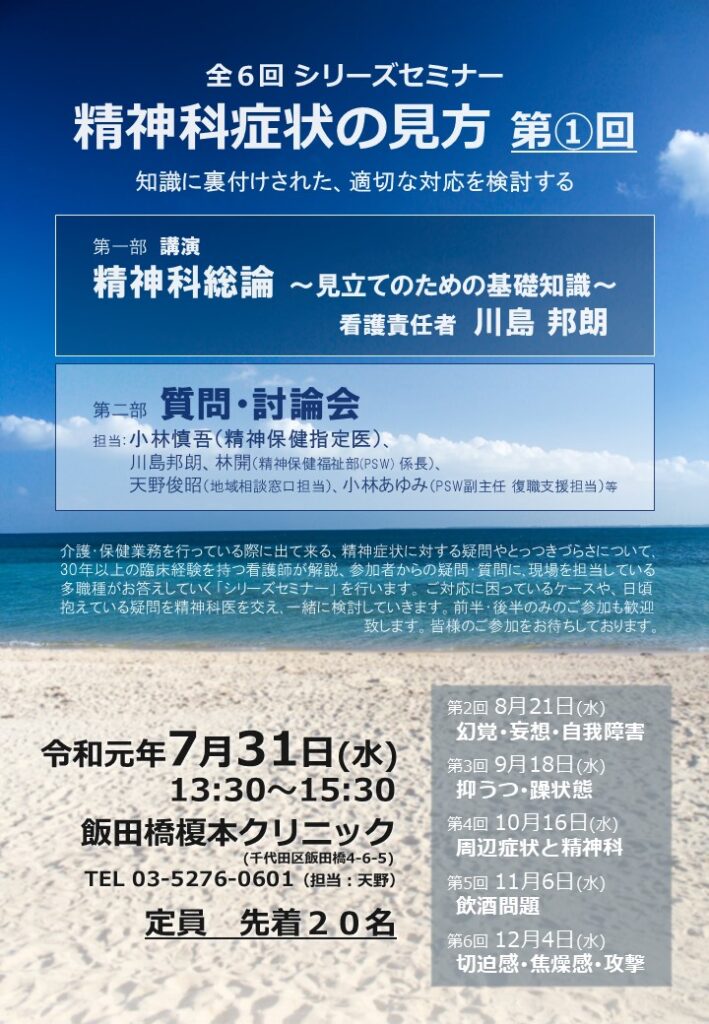 【2019.7.31(水)】飯田橋シリーズセミナー「精神症状の見方」第1回:精神科総論