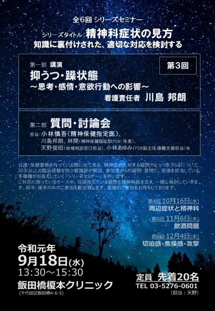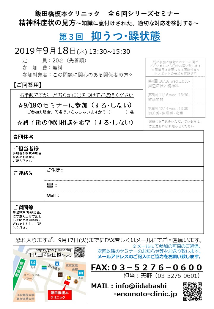 【2019.9.18(水)】飯田橋シリーズセミナー「精神症状の見方」第③回:抑うつ・躁状態