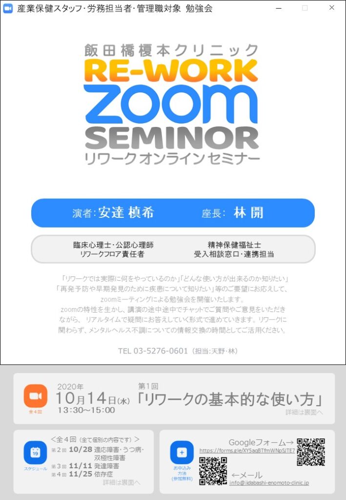 【2020.10.14】飯田橋リワークセミナー「リワークの基本的な使い方」※zoom開催