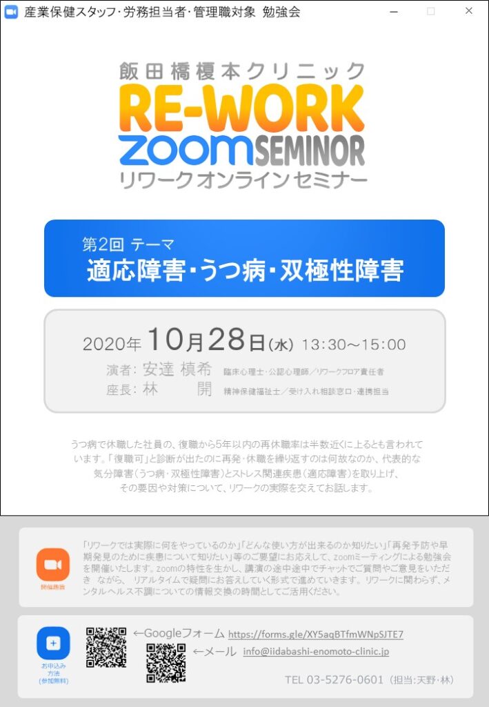 【2020.10.28】飯田橋リワークセミナー②「適応障害・うつ病・双極性障害」※zoom開催
