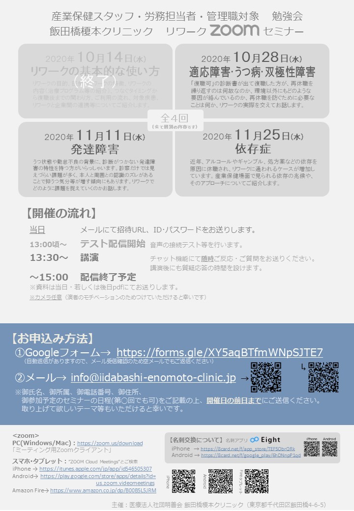 チラシpdf→2020.10.28飯田橋榎本Cliリワークセミナー②適応障害うつ病双極性障害