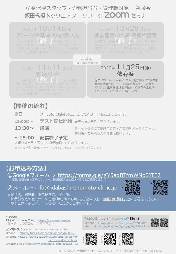 【2020.11.25】飯田橋リワークセミナー④「依存症」※zoom開催