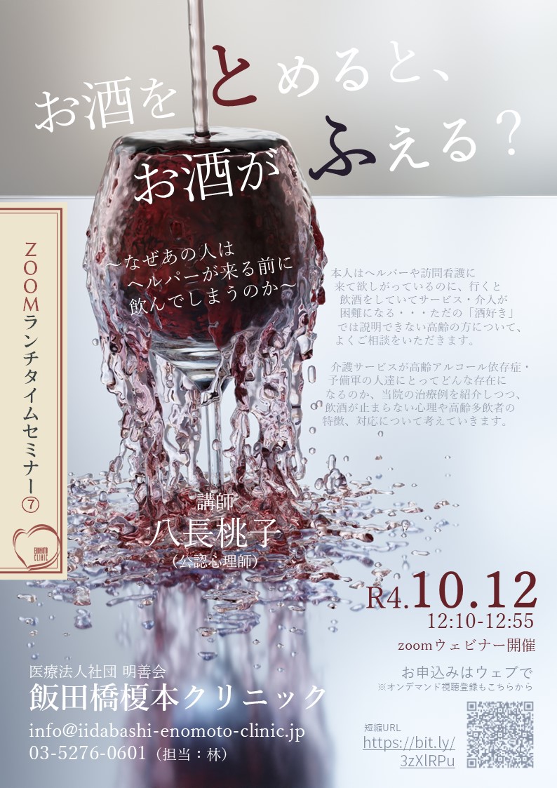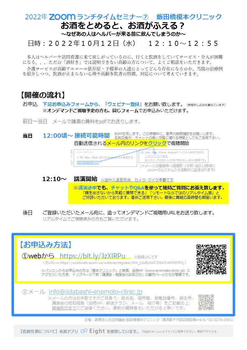 pdfはコチラ→2022.10.12飯田橋榎本Cli「酒を止めるとお酒がふえる」講演会ご案内