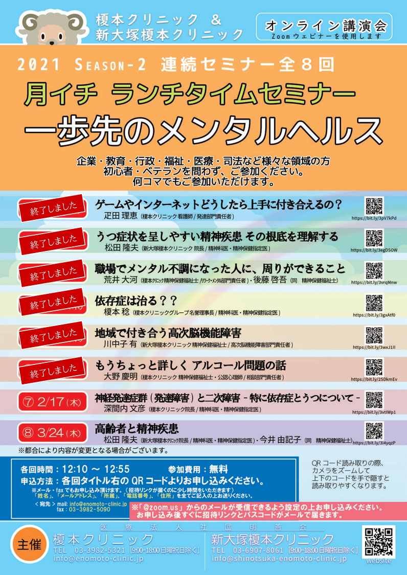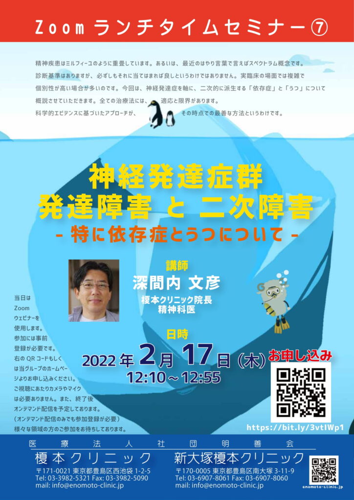 【2022/2/17】Zoomランチタイムセミナ-⑦ 「神経発達症群(発達障害)と二次障害 -特に依存症とうつについて-」
