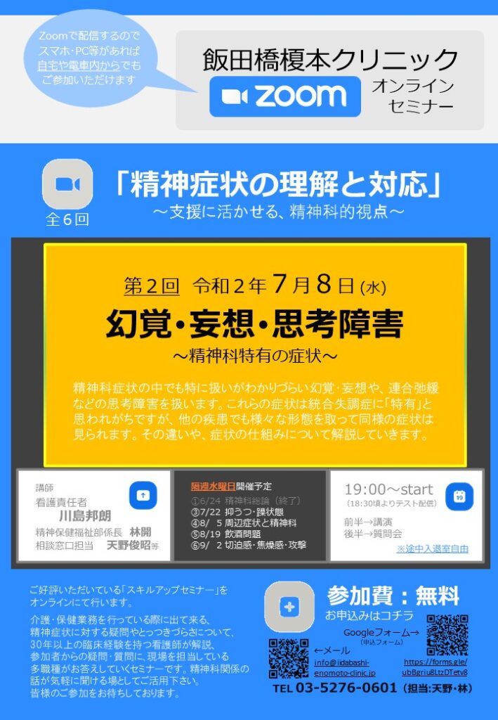 【R2.7.8水】飯田橋Zoomセミナー「精神症状の理解と対応」第②回:幻覚 ・妄想 ・思考障害