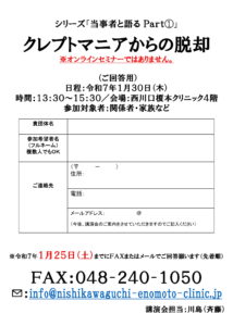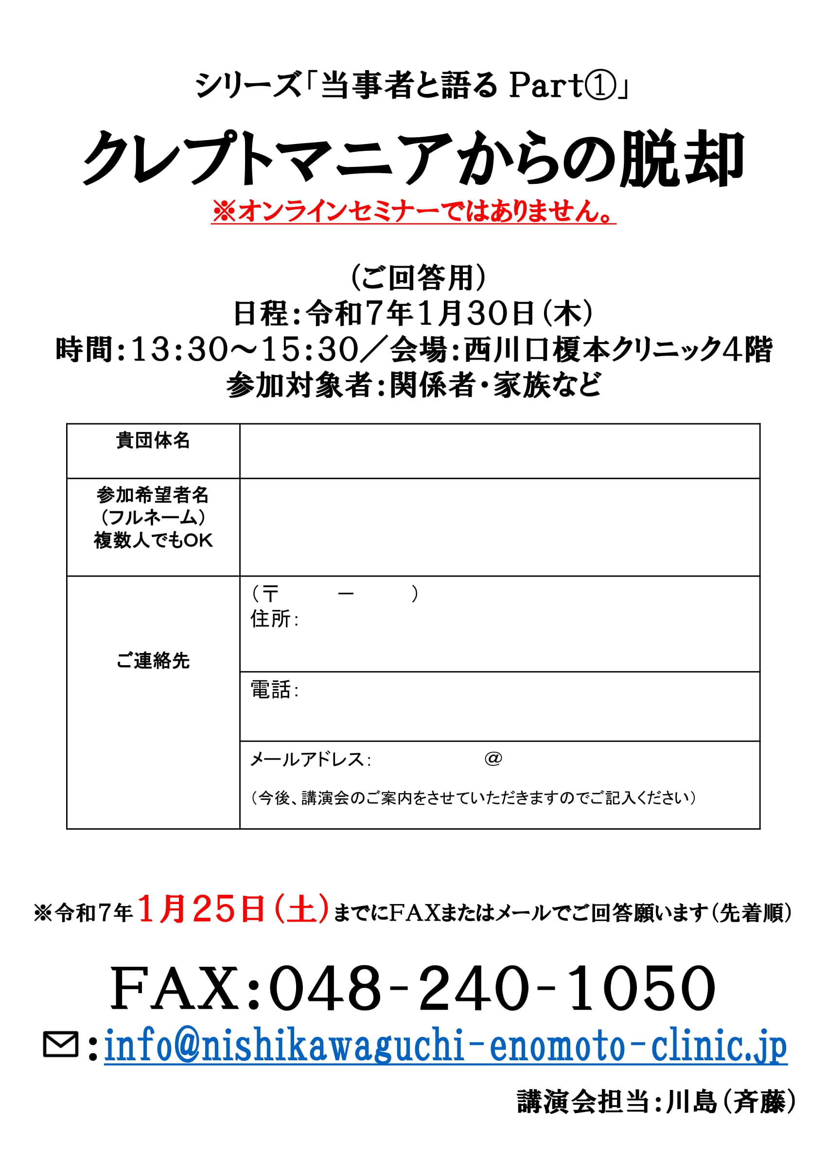 西川口榎本クリニック連続セミナー 第1回 シリーズ「当事者と語る」 クレプトマニアからの脱却