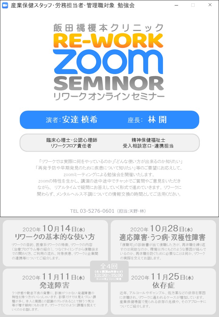 【産業保健・労務担当・管理職対象】飯田橋リワークzoomセミナーのお知らせ