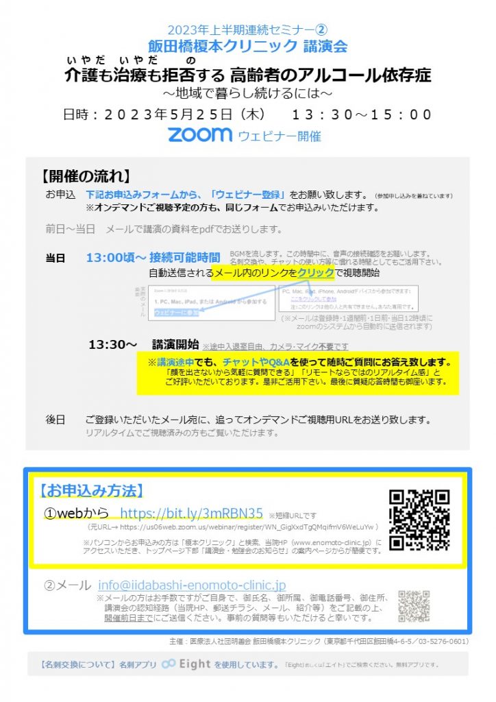 pdfはコチラ→2023.5.25飯田橋榎本Cli「いやだいやだの高齢者のアルコール依存症」講演会案内