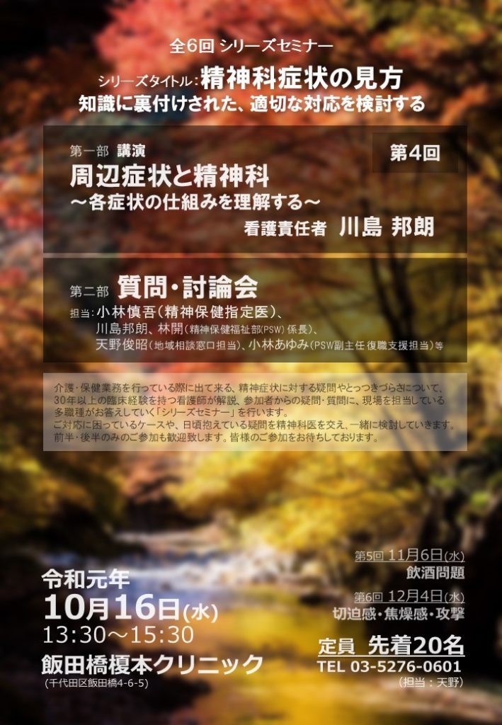 【2019.10.16(水)】飯田橋シリーズセミナー「精神症状の見方」第④回:周辺症状と精神科