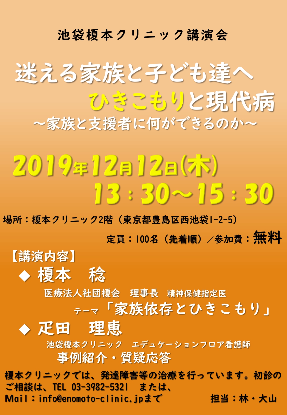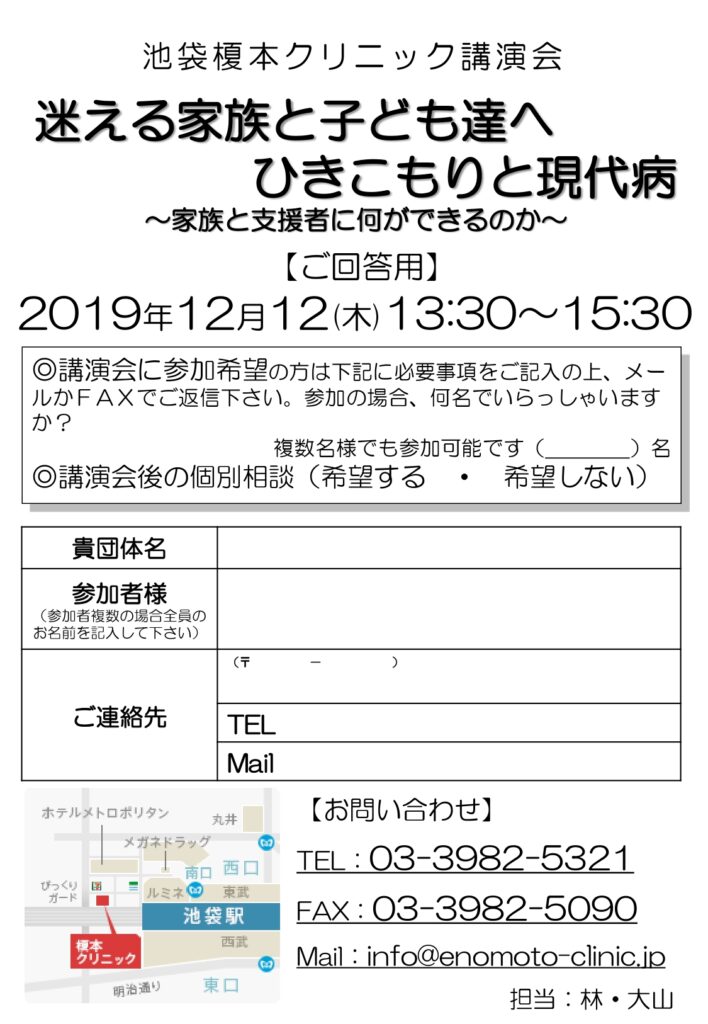 【2019.12.12(木)】榎本クリニック講演会 迷える家族と子ども達へひきこもりと現代病
