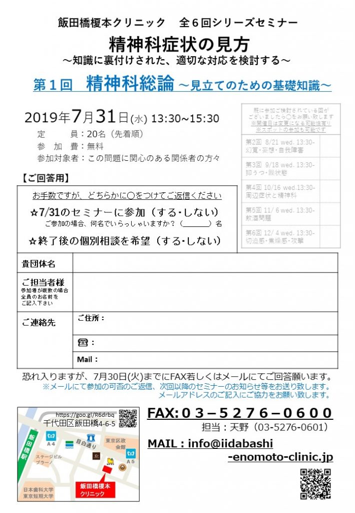 【2019.7.31(水)】飯田橋シリーズセミナー「精神症状の見方」第1回:精神科総論