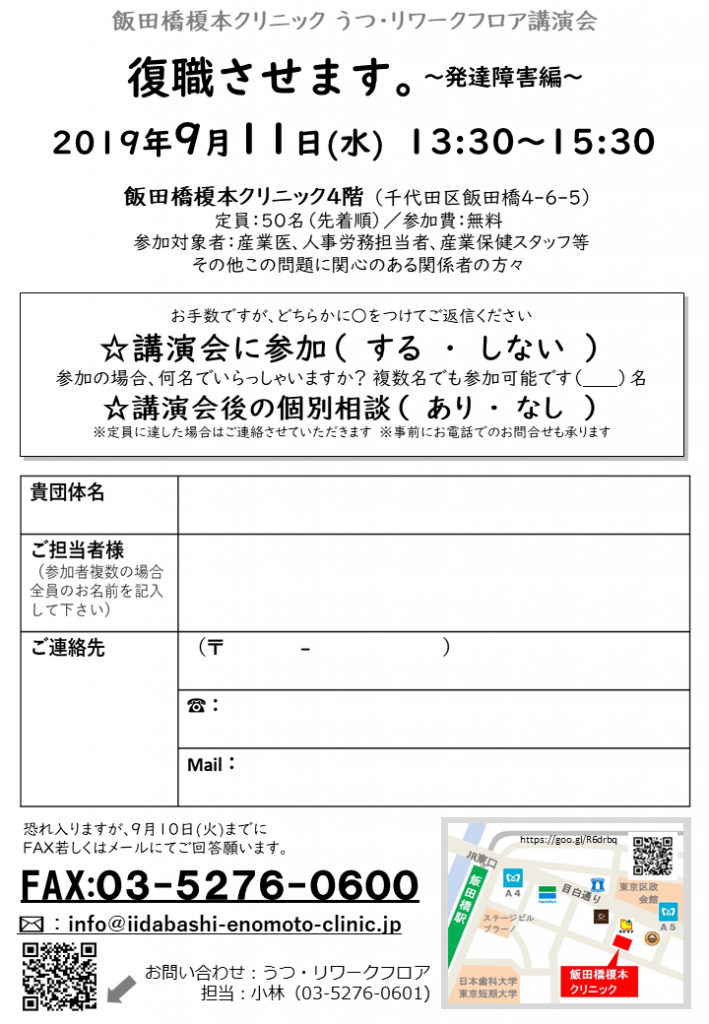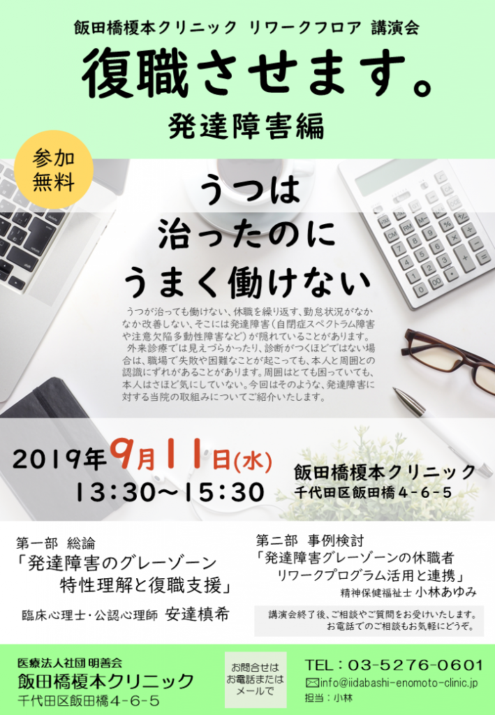 【2019.9.11(水)】飯田橋リワークフロア講演会「復職させます。発達障害編:うつは治ったのにうまく働けない」