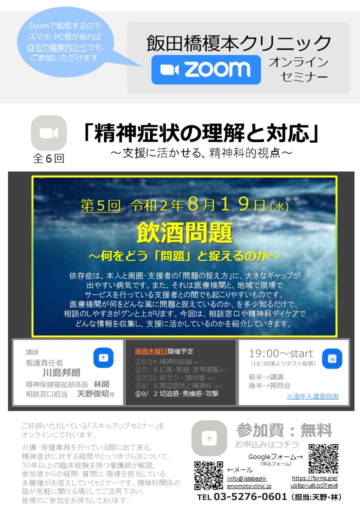 【R2.8.19水】飯田橋Zoomセミナー「精神症状の理解と対応」第⑤回:飲酒問題