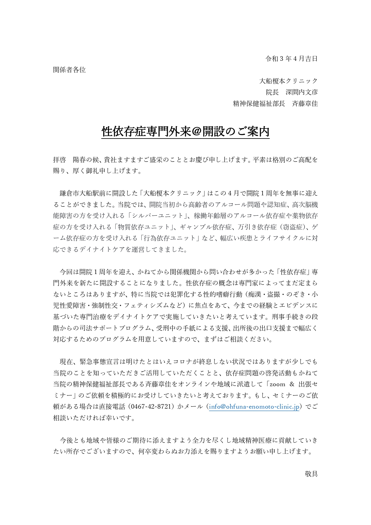 大船榎本クリニック 性依存症専門外来@開設のご案内