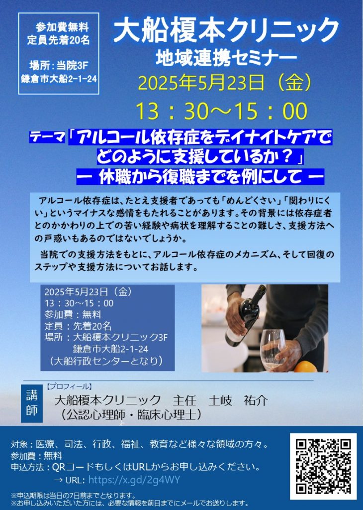| 講師 | 大船榎本クリニック 主任 本講演では、当院での支援方法をもとに、アルコール依存症のメカニズム、そしてそこからの回復の段階や、回復を手助けするための関わり方についてお話します。  |