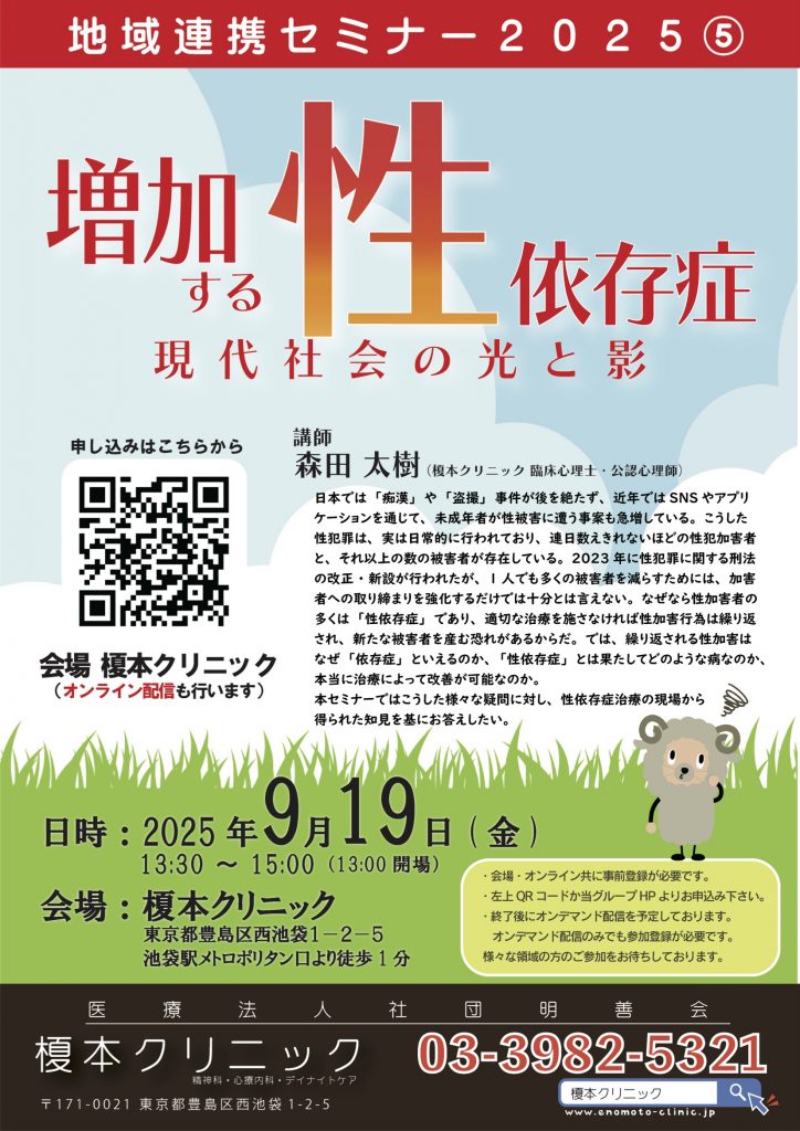 | 講師 | 森田 大樹(榎本クリニック 臨床心理士・公認心理師) 日本では「痴漢」や「盗撮」事件が後を絶たず、近年ではSNSやアプリケーションを通じて、未成年者が性被害に遭う事案も急増している。こうした性犯罪は、実は日常的に行われており、連日数えきれないほどの性犯加害者と、それ以上の数の被害者が存在している。2023年に性犯罪に関する刑法の改正・新設が行われたが、1人でも多くの被害者を減らすためには、加害者への取り締まりを強化するだけでは十分とは言えない。なぜなら性加害者の多くは「性依存症」であり、適切な治療を施さなければ性加害行為は繰り返され、新たな被害者を産む恐れがあるからである。では、繰り返される性加害はなぜ「依存症」といえるのか、「性依存症」とは果たしてどのような病なのか、本当に治療によって改善が可能なのか。本セミナーではこうした様々な疑問に対し、性依存症治療の現場から得られた知見を基にお答えしたい。  |