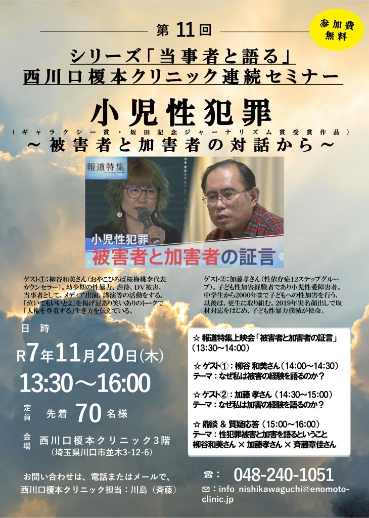 子ども性加害経験者であり小児性愛障害者。中学生から2000年まで子どもへの性加害を行う、以後は更生に取り組む。2019年実名顔出しで取材対応をはじめ、子ども性暴力撲滅が使命。 |