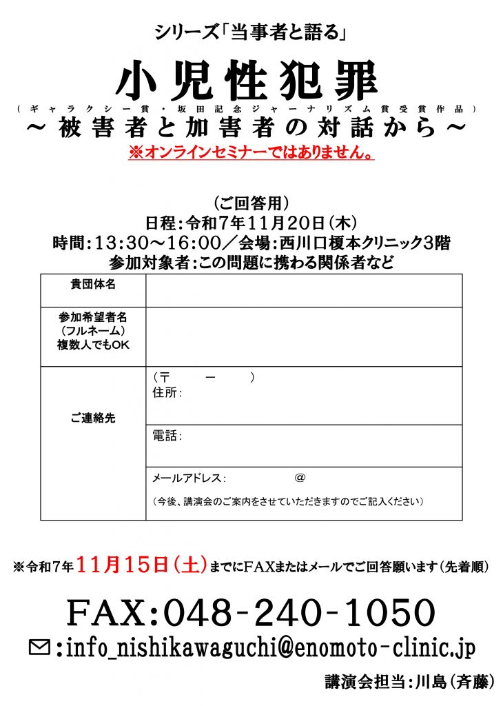 | 場所 | 西川口榎本クリニック 3F(埼玉県川口市並木3-12-6) |