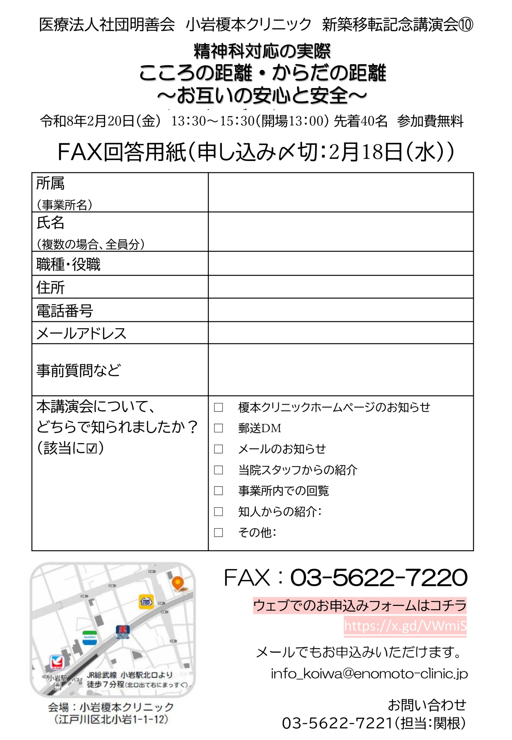 | 会場・定員 | 小岩榎本クリニック(江戸川区北小岩1-1-12)