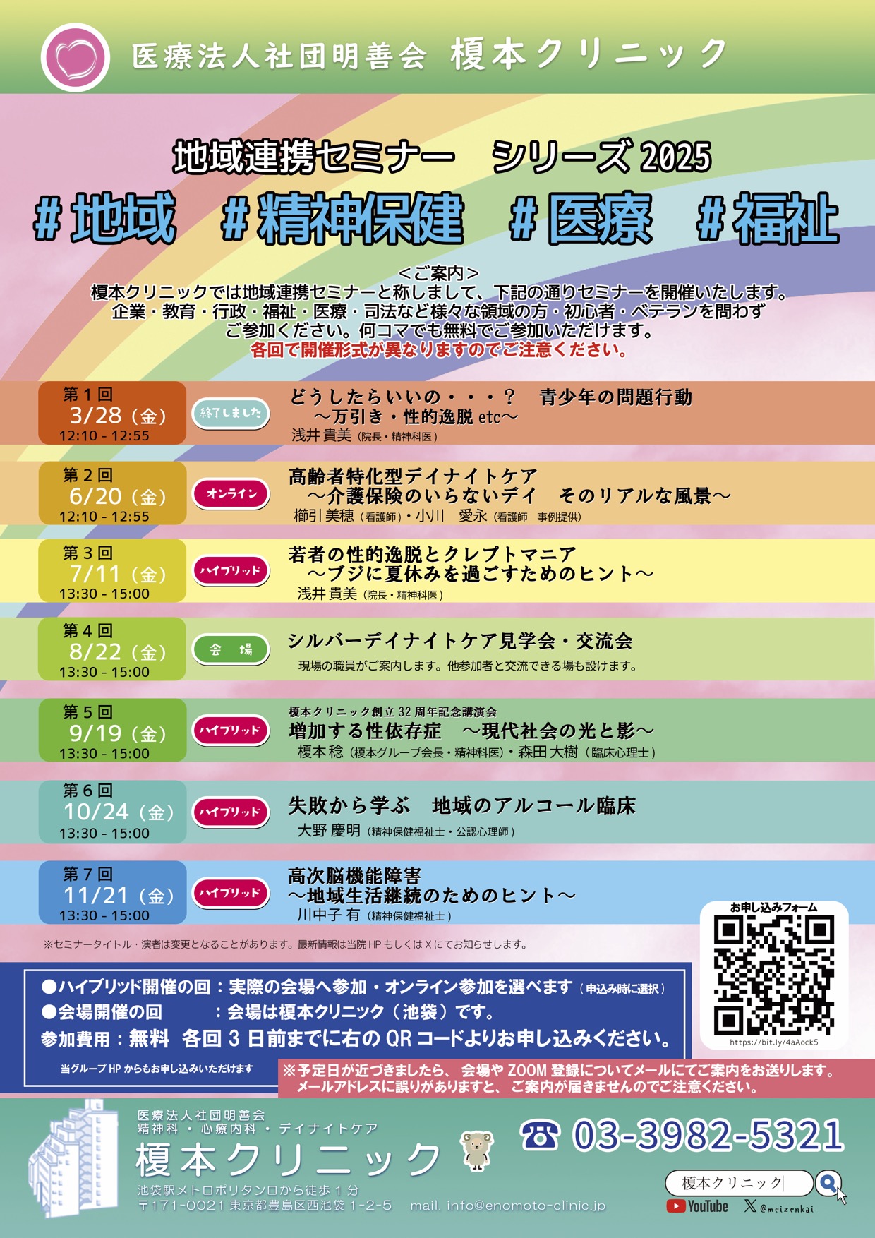 好評頂いておりました地域連携セミナーシリーズが帰ってきました!高齢者・若者・アルコール・性の問題・高次脳機能障害、と今年も幅広い内容でお届けします。是非ご参加ください。