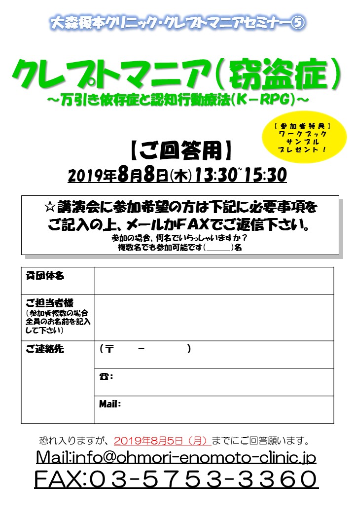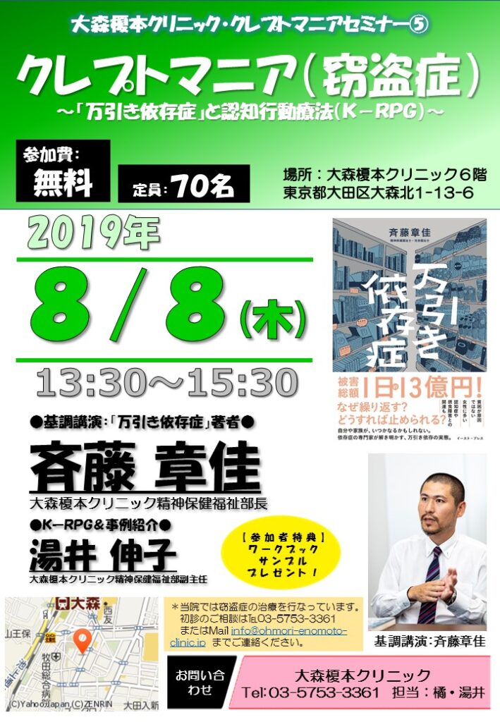 【2019.8.8(木)】大森榎本クリニック講演会 「万引き依存症と認知行動療法」